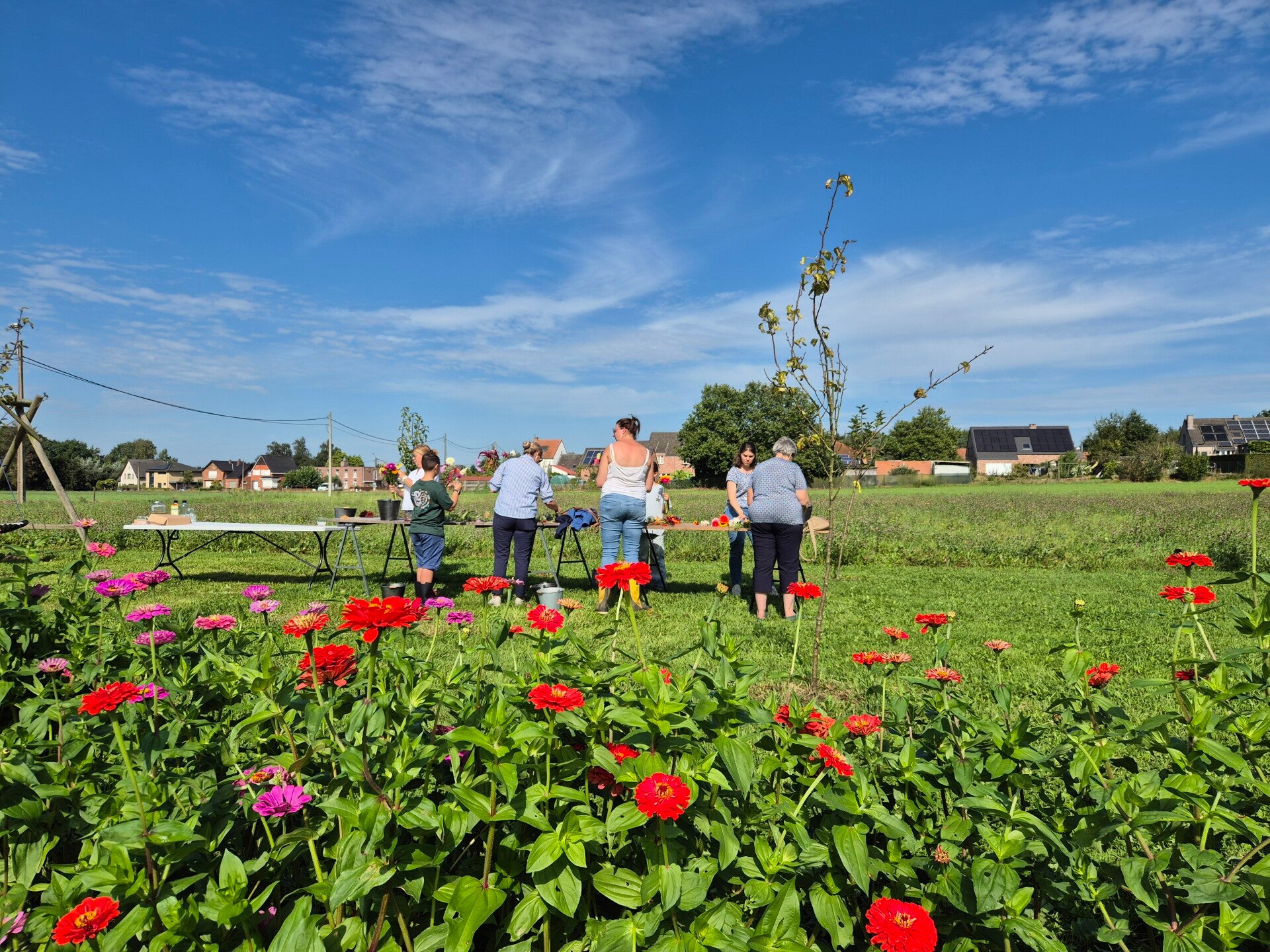 De workshop vindt plaats op het veld, tussen de bloemen.